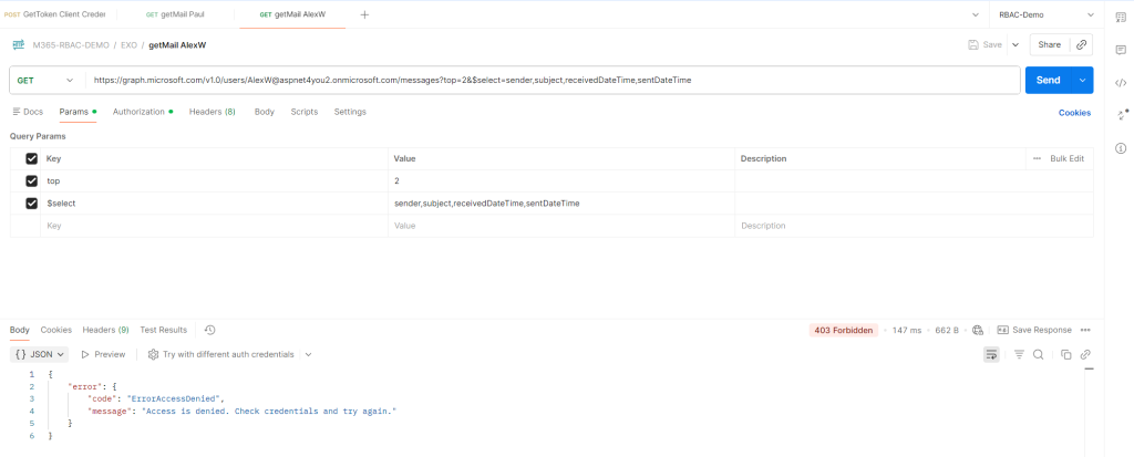 • As per setup, the app can access mailbox of Paul and Bob, but it can’t access Alex or other user’s mailboxes.